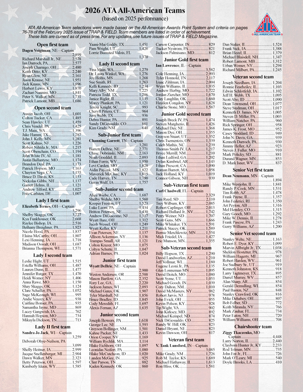 The following 10 Texas shooters made the 2026 All American Trapshooting Team! They competed against the best shooters from every state in the country. They travelled across the entire USA and shot in all the elements that nature could throw at them including extreme heat, howling wind & torrential rain. Congratulations on your achievement, dedication to the sport and comaraderie towards your fellow shooters!